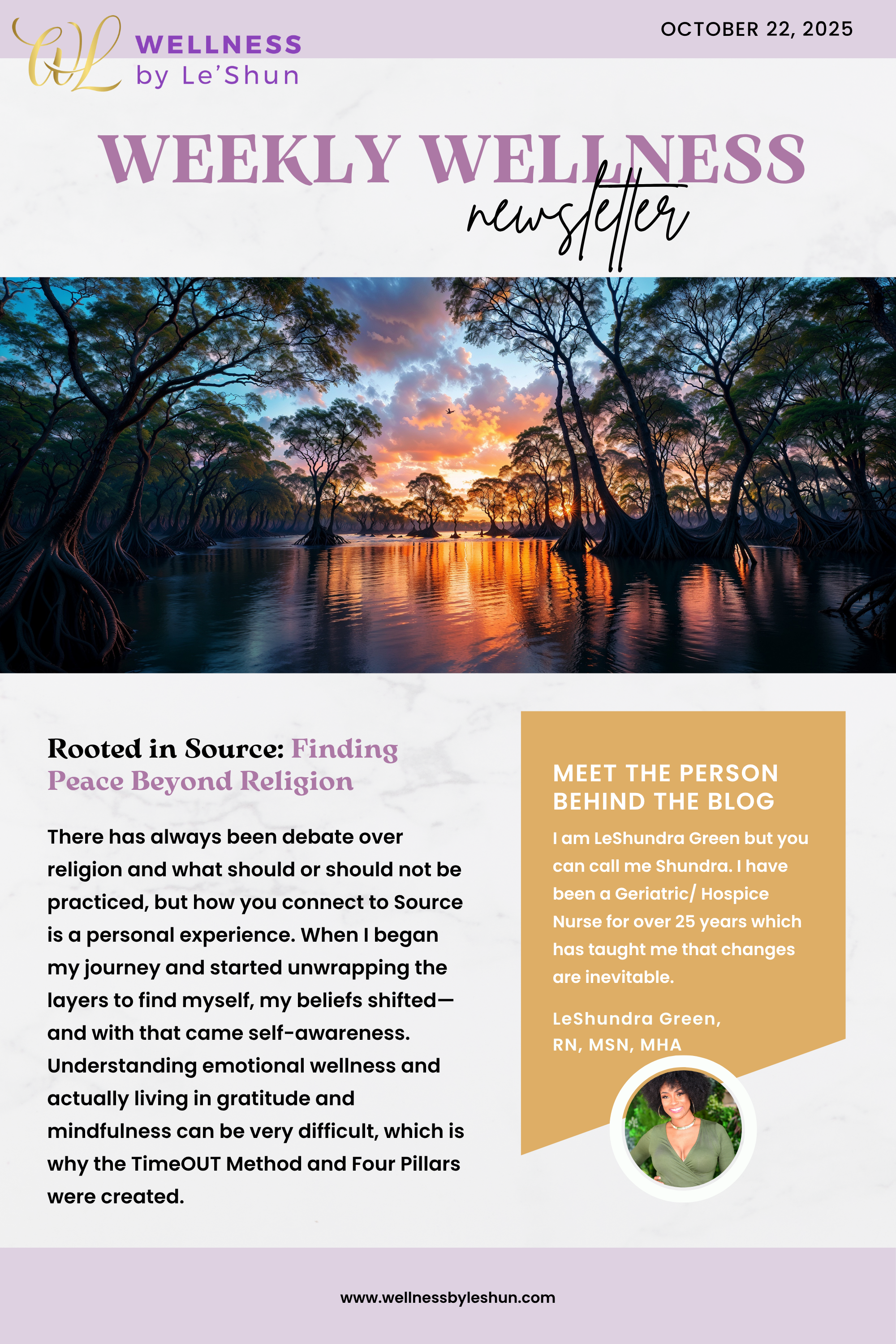Rooted in Source: Finding Peace Beyond Religion Oct 23 Written By LeShundra Green DOWNLOAD THE FREE MINI TIMEOUT REFLECTION JOURNAL LeShundra Green