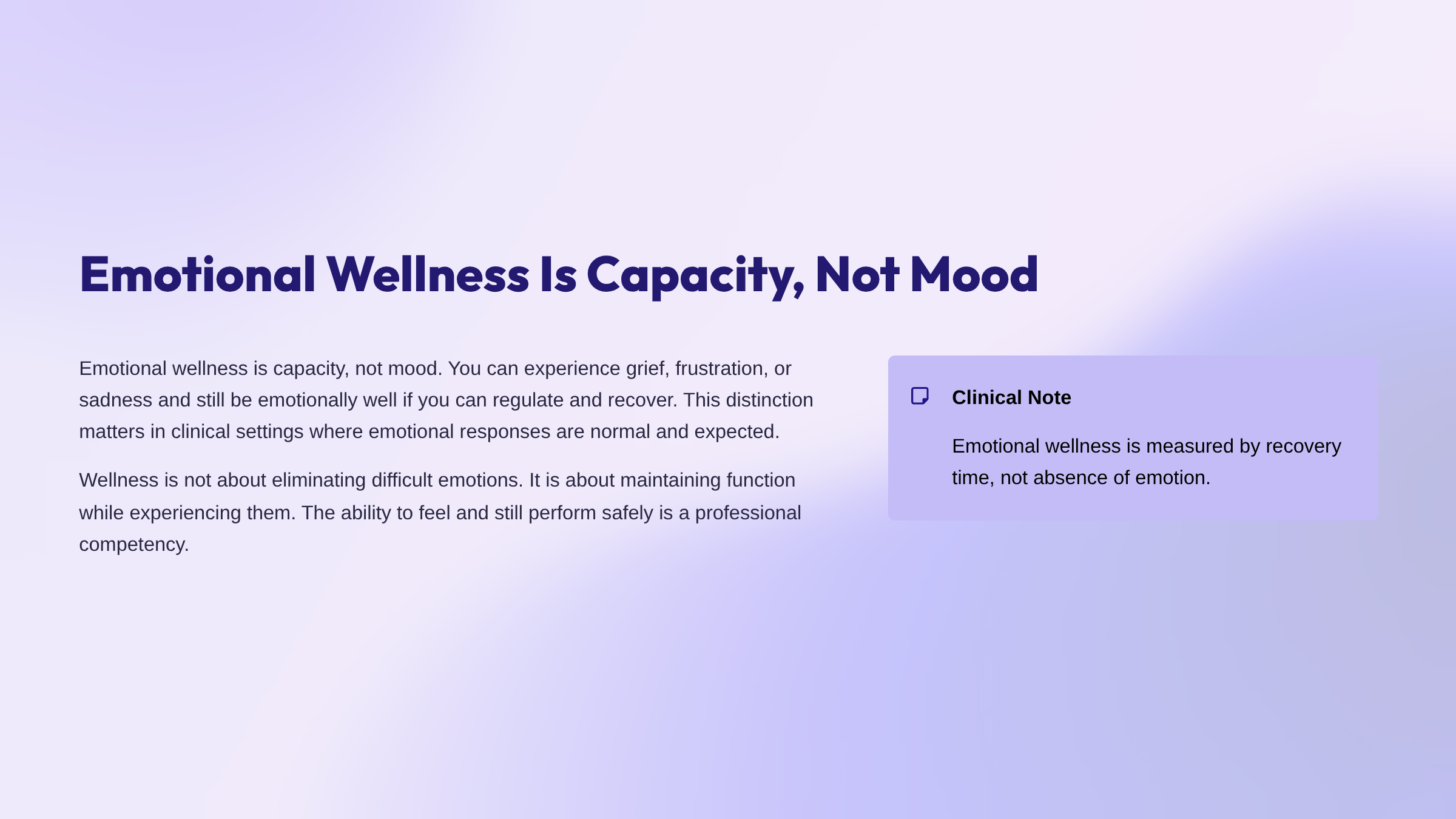 You’ll reframe emotional wellness as the ability to function and recover, rather than the absence of difficult emotions. You’ll learn why experiencing emotions does not prevent you from delivering safe, effective care.
